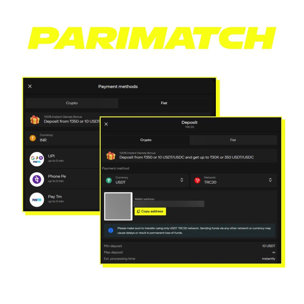 At the moment, we support three main payment methods that work seamlessly in India. With these methods, all money transfers are secure and credited to your account instantly. Check out the Parimatch deposit methods below.