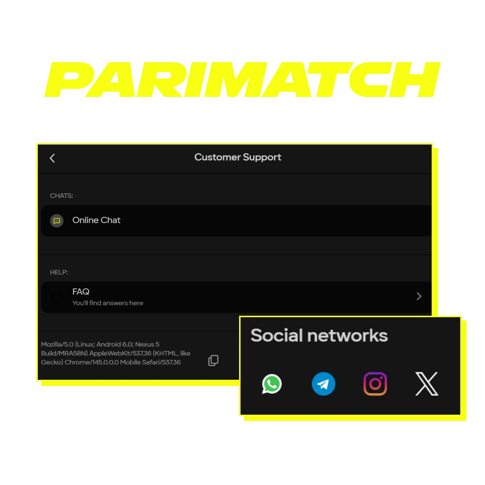 The fastest way to get an answer. Click the yellow button in the bottom right corner of the Parimatch website or app. The average response time is 1 to 2 minutes. You will need to provide your name and email or log in through your account. Live chat is the best option for quick questions about payments, bonuses, or account settings.
